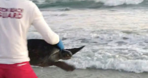 A lifeguard transports a Green Sea Turtle back to the ocean after it was caught off Huntington Beach Pier.